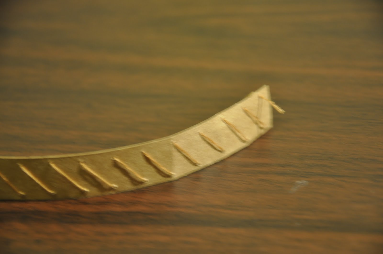 Therefore I decided on making holes through another piece of card which could hold the structural elements when needed with the use of loops made with the thread: This way the structural elements could be slipped in or out of the holes as needed. If they were taken out, the entire facade would be flat and able to be dismantled easily.